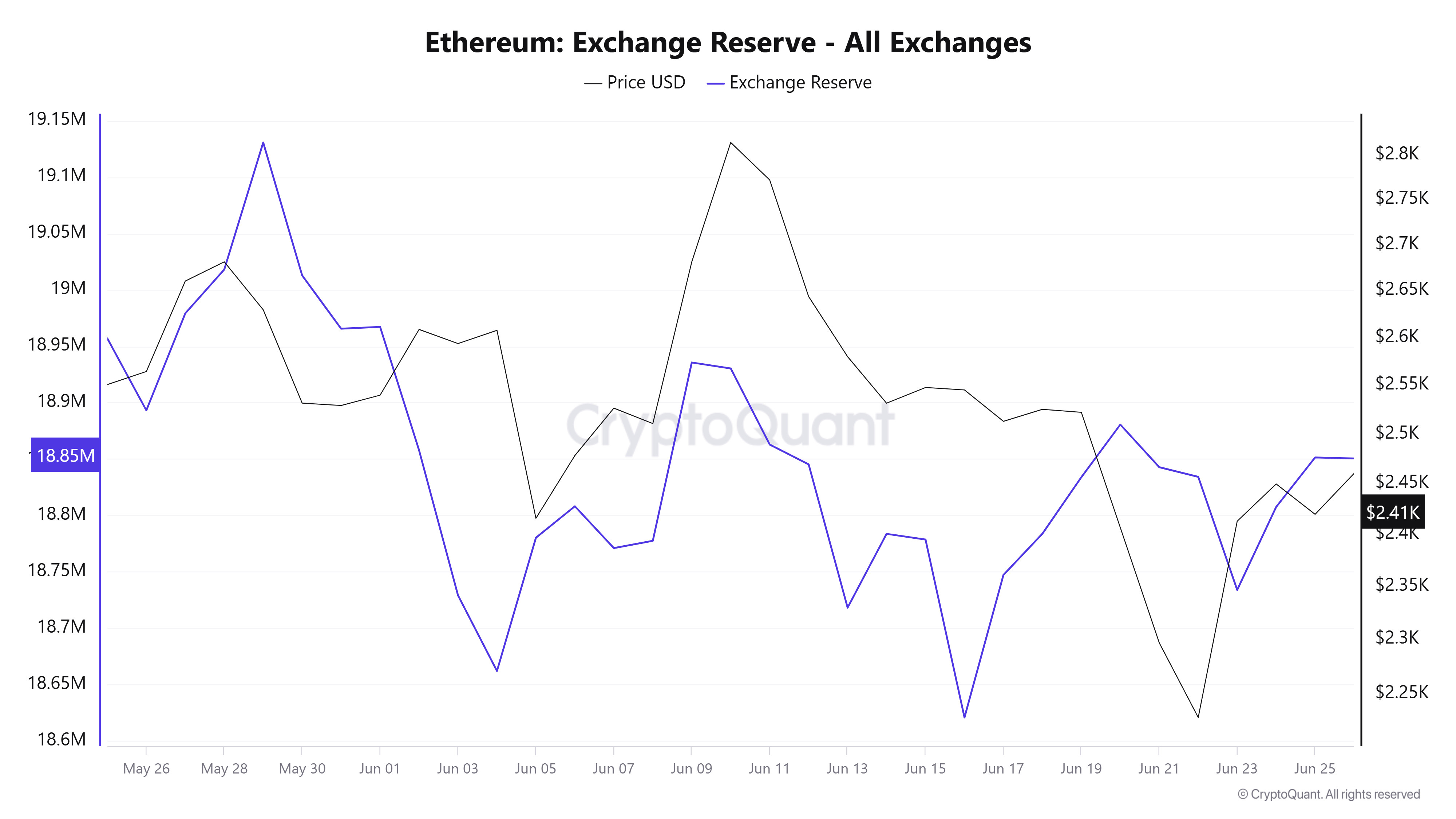بعد يومين من الارتفاع المتواصل بعد وقف إطلاق النار بين إسرائيل وإيران، تراجع الزخم الصعودي، وانخفض إيثريوم بنسبة 1%. سبب هذا الانخفاض هو زيادة احتياطي إيثريوم في البورصات، مما يشير إلى ضعف الطلب، وزيادة طفيفة في ضغط البائعين.