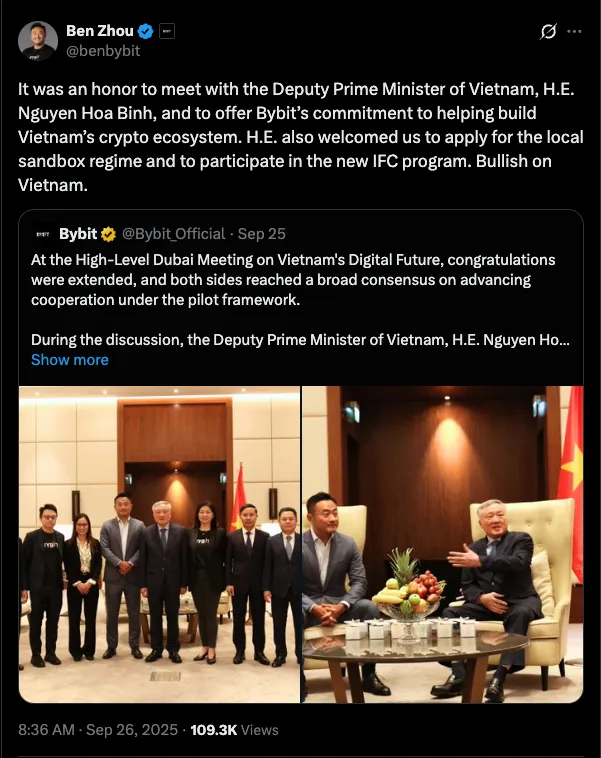 تتسم Bybit أيضًا بشراسة هجومية. في 17 سبتمبر 2025، وقعت مذكرة تفاهم ثلاثية مع لجنة الشعب في دا نانغ ومركز أبوظبي للتشفير وVerichains، تغطي التعاون في توفير السيولة، وأمان البنية التحتية، والاتصال البيئي، بما يتماشى بدقة مع أهداف التنظيم الفيتنامية. على الرغم من عدم الوصول إلى مستوى الاجتماعات العليا مثل Binance، إلا أنها تضع أساسًا عمليًا لمشاركتها في بناء المركز المالي الدولي.