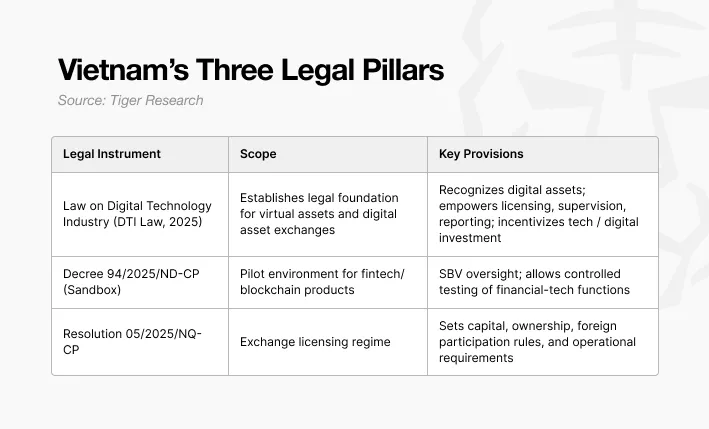 الإجراء الرئيسي الثاني هو قانون "صندوق الاختبار التنظيمي" الذي سيدخل حيز التنفيذ في 1 يوليو 2025. تحت قيادة البنك الوطني الفيتنامي، يوفر هذا النظام بيئة اختبار للابتكارات المالية. على الرغم من أنه لم يتم تصميمه خصيصًا للأصول الرقمية، من المتوقع أن يرتبط بنظام تراخيص التبادلات من خلال متطلبات أساسية مثل مكافحة غسل الأموال، والتحقق من هوية العملاء، والتسويات. أكثر ما يؤثر بشكل فوري هو القرار رقم 05/2025/NQ-CP الذي صدر في 9 سبتمبر 2025، والذي يطلق رسميًا تجربة إصدار وتداول الأصول الافتراضية لمدة خمس سنوات. وهذا يصبح الإطار العملي الأول لتشغيل التبادلات بشكل قانوني في فيتنام. القيود الرئيسية هي: خلال مرحلة التجربة، يمكن فقط للشركات المحلية الفيتنامية التقدم للحصول على تراخيص المشغلين، ويجب على التبادلات الخارجية المشاركة بشكل غير مباشر من خلال شراكات مشتركة أو تقديم الدعم الفني، ونظام الامتثال، ودعم السيولة.