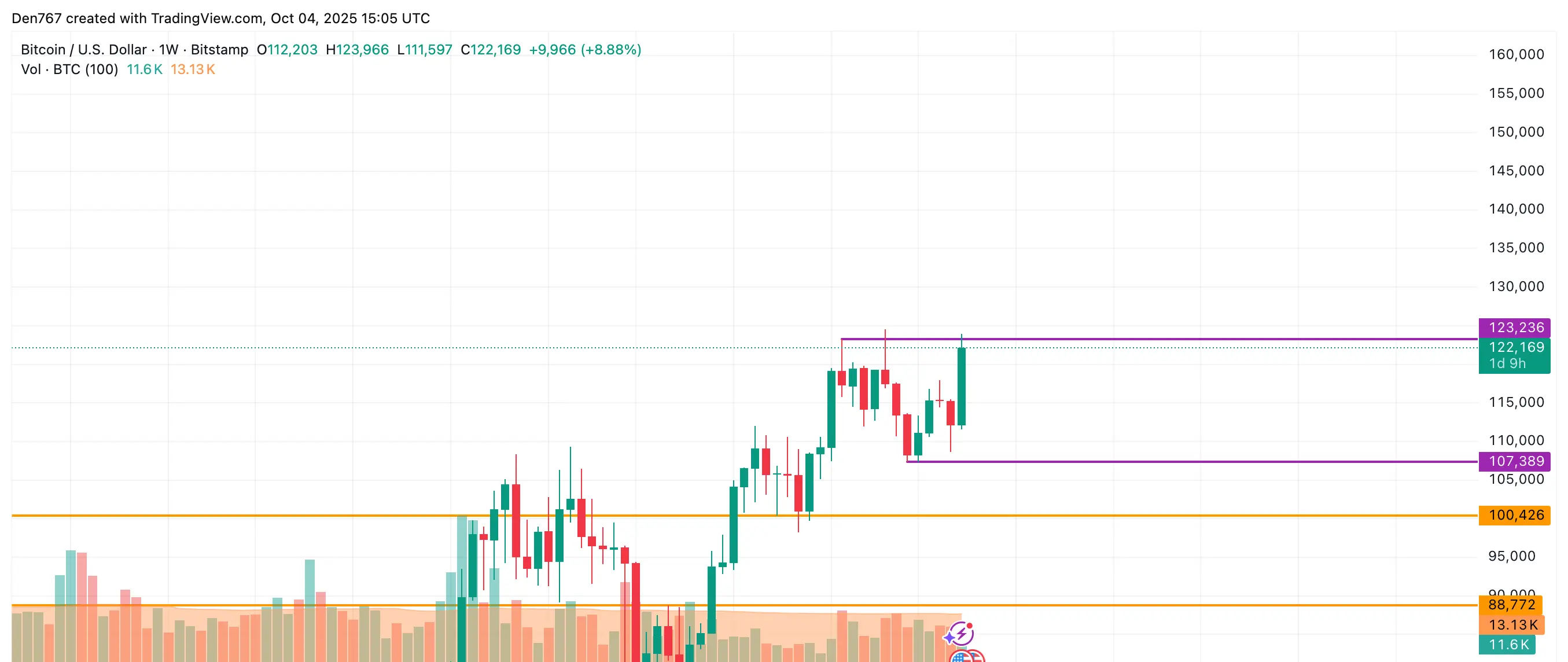 من وجهة نظر منتصف المدة ، ارتد سعر BTC مرة أخرى عن مستوى المقاومة البالغ 123,236 دولار. إذا كان بإمكان المشترين الحفاظ على المبادرة ، فهناك فرصة كبيرة لرؤية أعلى مستوى على الإطلاق جديد.