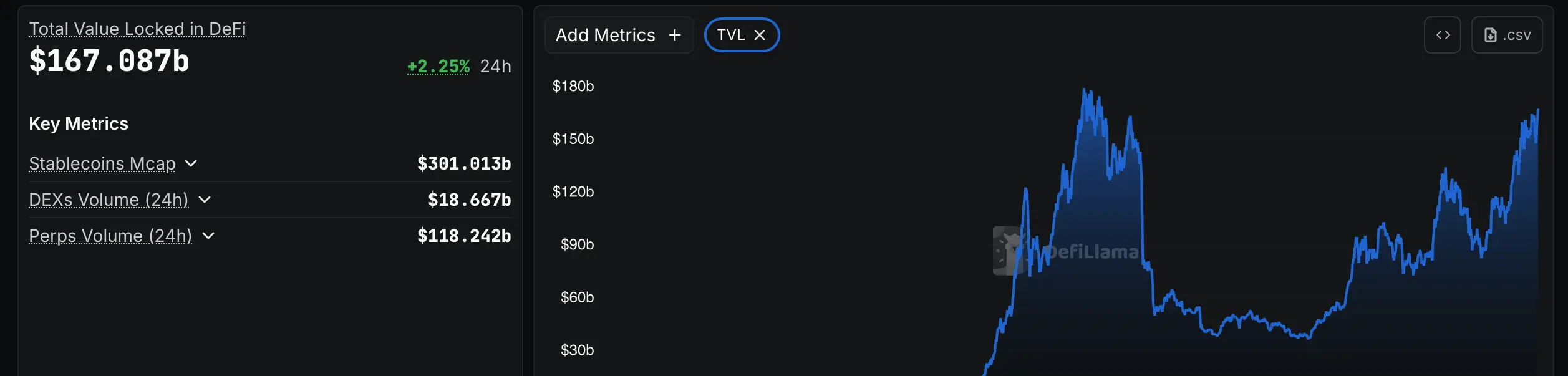 في آخر 24 ساعة، تظهر الإحصائيات أن DeFi أضافت 3.677 مليار دولار إلى إجمالي القيمة المقفلة، مقتربًا من الرقم القياسي البالغ 178.841 مليار دولار الذي تم تسجيله في 9 نوفمبر 2021. لا يزال يتعين على القيمة المقفلة الحصول على دفعة أخرى بقيمة 11.754 مليار دولار لتحطيم الرقم القياسي. تأتي هذه المطاردة للمعلم بينما يجلس الاقتصاد المشفر الأوسع عند 4.21 تريليون دولار، حيث يُظهر سوق العملات المستقرة وحده أكثر من $300 مليار دولار في القيمة.