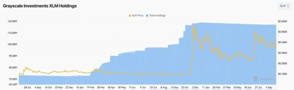 وفقًا لبيانات من Coinglass، زادت حيازات Grayscale من عملة XLM من 100 مليون إلى 120 مليون عملة بين يوليو وأكتوبر 2025.