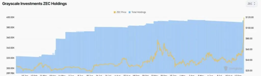 استنادًا إلى بيانات من Coinglass، زادت حيازات Grayscale من ZEC من 320,000 إلى 380,000 عملة بين يناير وأغسطس 2025. جنبًا إلى جنب مع ذلك، قفز سعر ZEC من $20 إلى $120 بين أغسطس وأكتوبر 2025، مع بقاء عدد الحيازات مستقرًا على الرغم من زيادة تقلبات السوق.