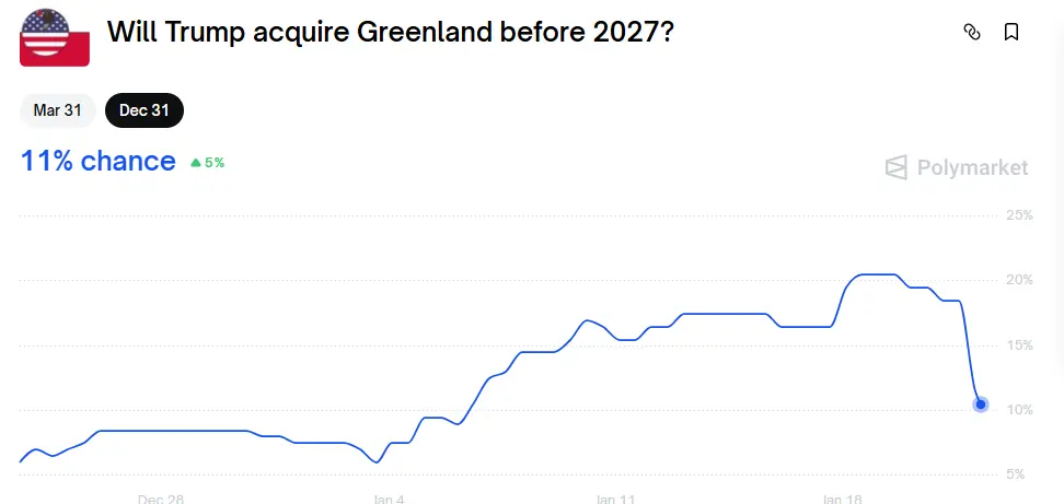 أدى التحول المفاجئ إلى إعادة تسعير حادة عبر العقود السياسية والاقتصادية على أسواق التنبؤ. على Polymarket، انخفضت احتمالات سؤال “هل سيستحوذ ترامب على غرينلاند قبل 2027؟” إلى 11% فقط.