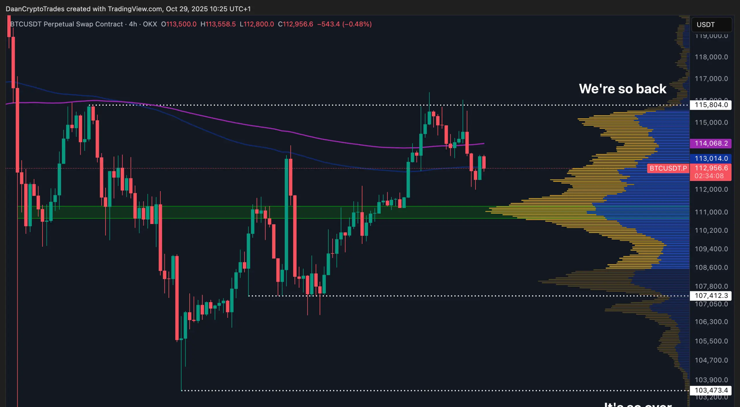 “BTC sigue dentro del rango. Se encontró con rechazo dos veces en $116,000 y ha regresado al nodo de alto volumen cerca de $111,000. Después de perder el 200MA (purple), actualmente se está negociando alrededor del 4H 200EMA (blue). Tras las ganancias recientes, hay una aparente pérdida de impulso. A corto y medio plazo, los niveles clave siguen en $107,000 y $116,000. Cualquier cosa entre medias es simplemente fluctuación.”