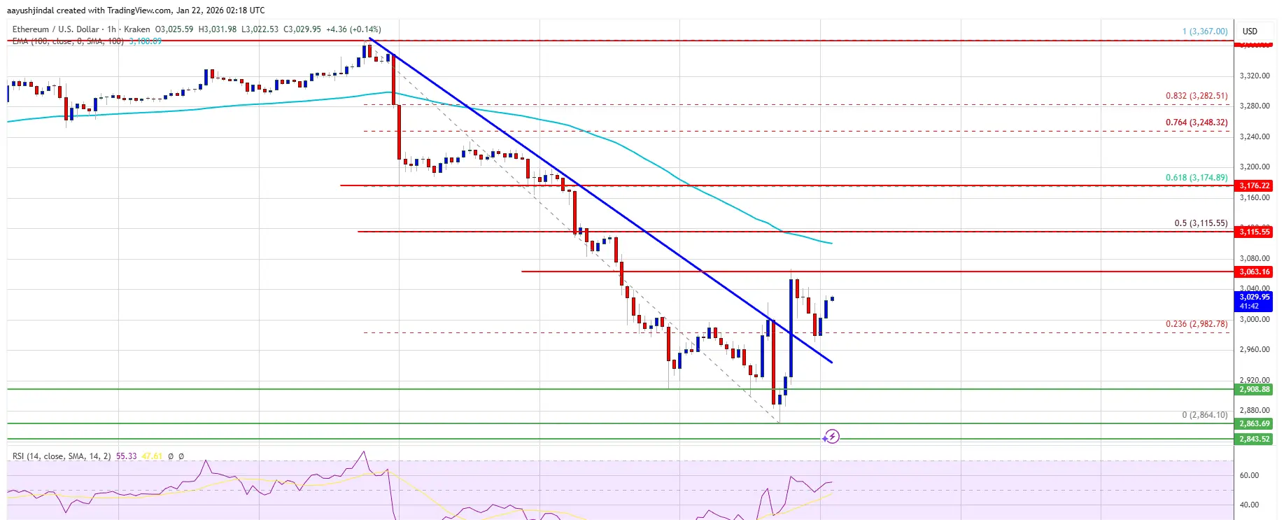 El precio de Ethereum ahora cotiza por debajo de $3,050 y de la Media Móvil Simple de 100 horas. Si los toros pueden protegerse de más pérdidas por debajo de $2,900, el precio podría intentar otro aumento.