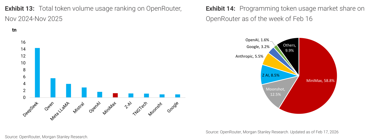 En pruebas independientes, cuando se lanzó MiniMax-M2, ocupó el quinto lugar en el ranking global de LLM; el modelo insignia más reciente, MiniMax-M2.5, quedó en sexto lugar y en modelos de código abierto, en cuarto. Hasta mediados de febrero de 2026, M2.5 lidera en OpenRouter en uso por token, alcanzando 1.97 billones de tokens, con una cuota de mercado del 58.8% en escenarios de programación.