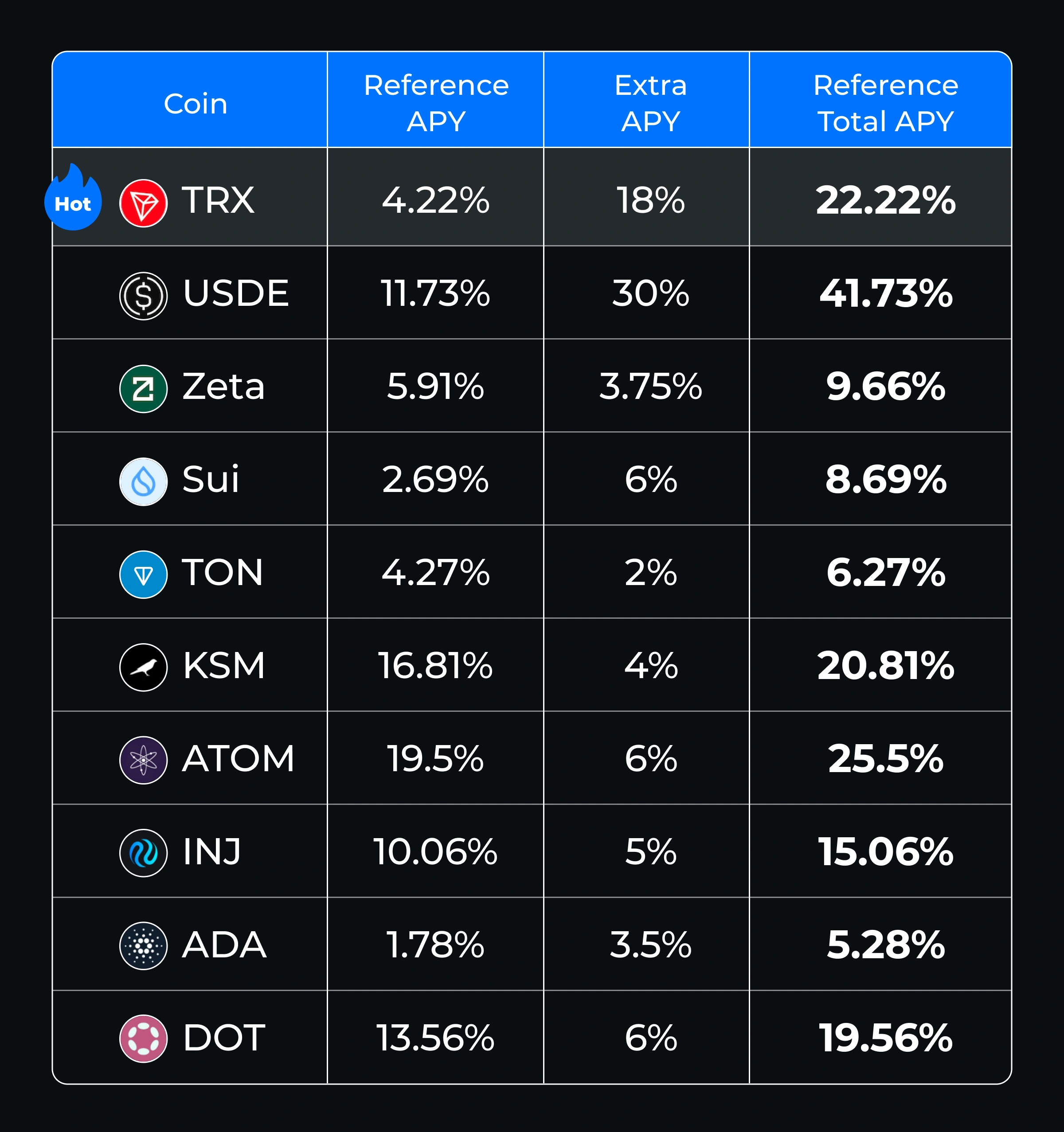*Le APY de référence est variable et peut fluctuer quotidiennement en fonction de la participation des utilisateurs et des rendements de Staking.