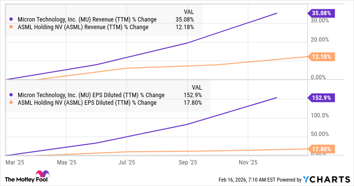 L’action Micron Technology a augmenté de plus de 313 % au cours de l’année écoulée, dépassant largement la hausse de 87 % des actions d’ASML sur la même période. En conséquence, la capitalisation boursière de Micron, de 463 milliards de dollars, n’est inférieure que de 18 % à celle d’ASML, et il ne sera pas surprenant de voir la première combler facilement cet écart dans l’année à venir, car les revenus de Micron croissent à un rythme nettement plus rapide que ceux d’ASML.