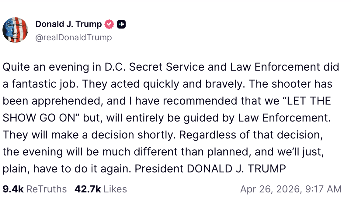 Une fusillade survient lors du dîner de l’Association des journalistes de la Maison Blanche (WHCA) au Hilton de Washington. Le président Trump est évacué en urgence sous la protection du service secret, le suspect étant un homme de 31 ans de Californie, Cole Allen.