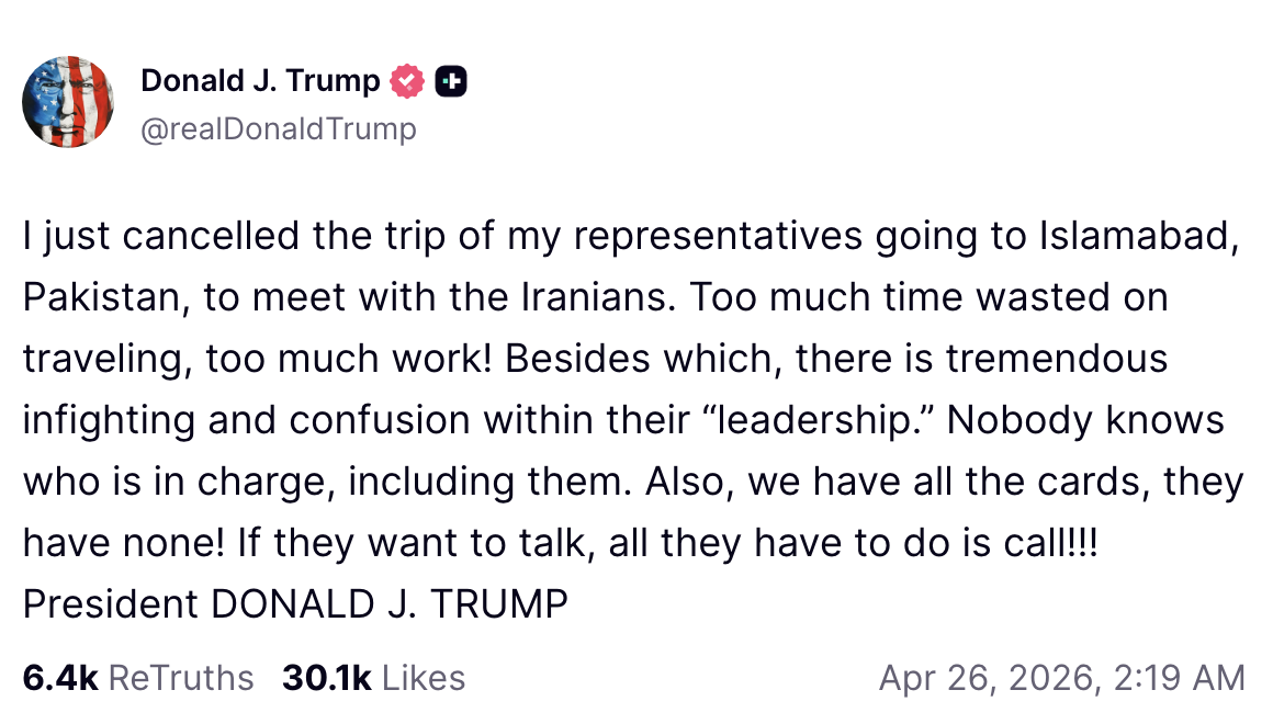 Source : Truth Social/@realDonaldTrump Trump annonce soudainement l’annulation de la désignation d’un envoyé spécial pour négocier un cessez-le-feu entre le Pakistan et l’Iran