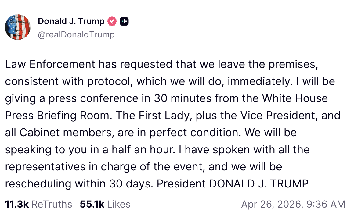 Source : CNBC Lors du dîner des journalistes de la Maison Blanche, après avoir entendu plusieurs coups de feu, le président Trump a été évacué sous escorte du service secret
