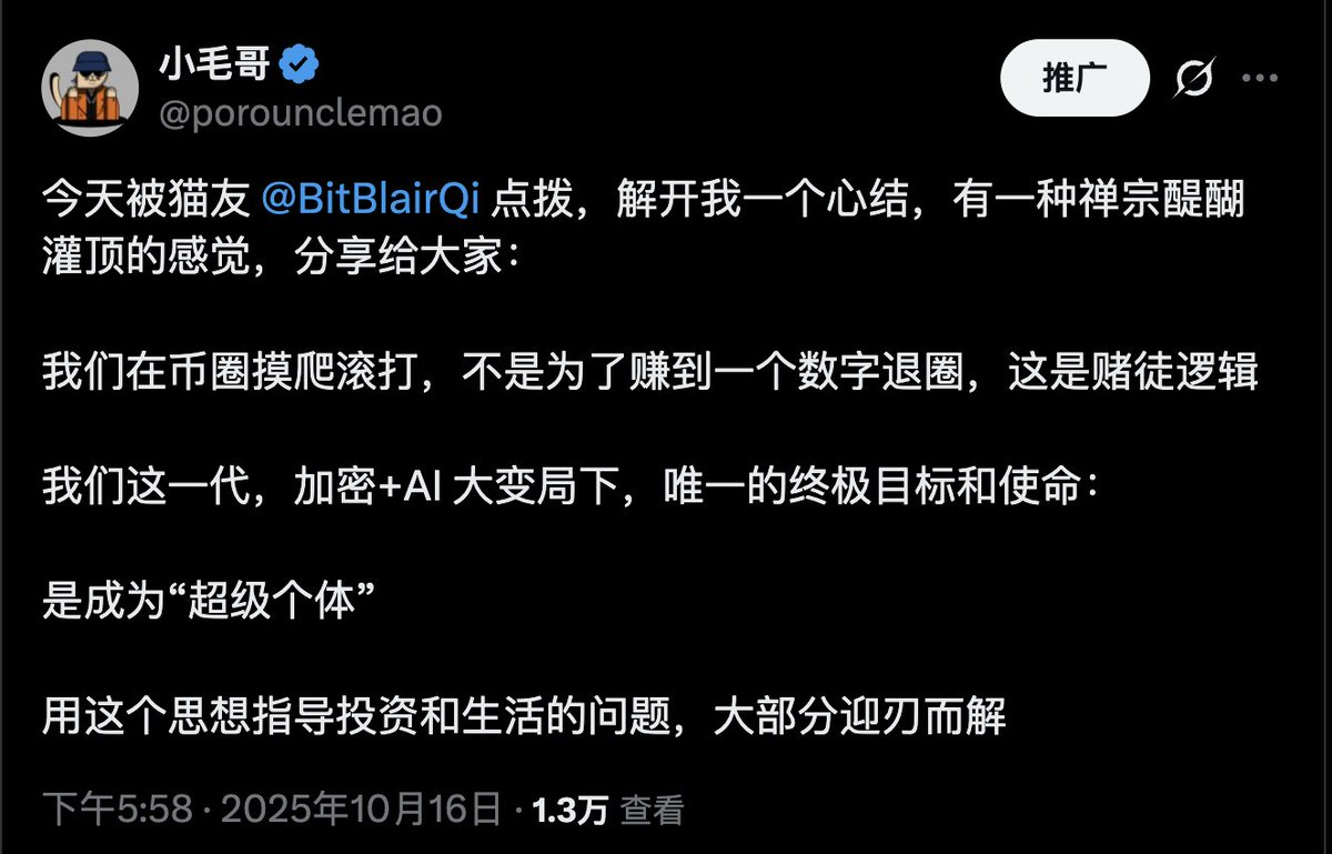 Di era AI + Crypto, Super Individual adalah mereka yang, di tengah dominasi algoritma dan modal, mampu menguasai produktivitas berbasis AI dan kedaulatan finansial—mencapai kemandirian dalam pola pikir, kekayaan, dan pengaruh.