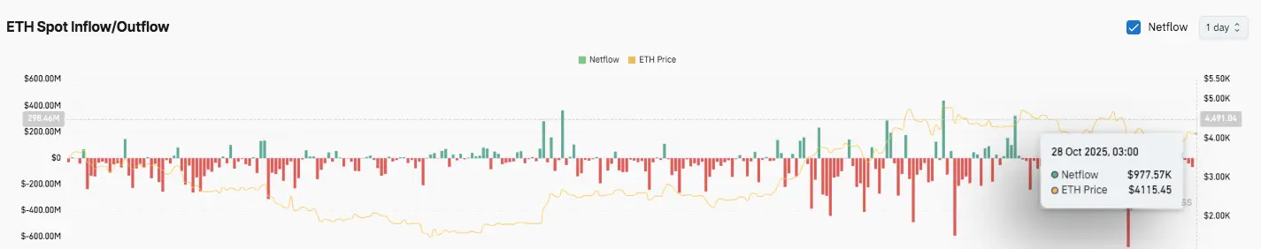 Baru-baru ini, Ethereum mencatat aliran bersih positif yang modest sebesar $977.000, menunjukkan kepercayaan yang diperbarui saat harga stabil di dekat $4.115. Perubahan halus ini mengisyaratkan fase akumulasi yang hati-hati yang dapat mendahului pergerakan yang lebih kuat ke atas.