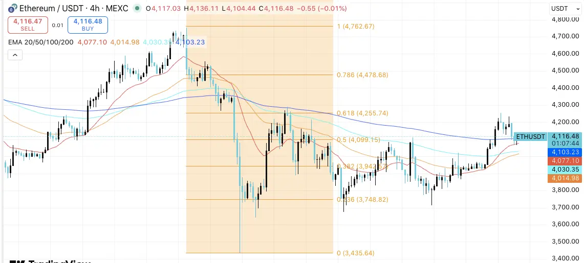 Level kunci tetap jelas terdefinisi saat Ethereum diperdagangkan di dekat $4.116, tetap kuat setelah pemulihan yang kuat dari rendah $3.435. Target kenaikan termasuk $4.255 (0.618 Fibonacci) dan $4.478 (0.786 level), keduanya berfungsi sebagai zona resistensi kritis. Penembusan di atas $4.255 dapat membuka jalan menuju $4.500 dan berpotensi $4.700 jika momentum terbentuk.