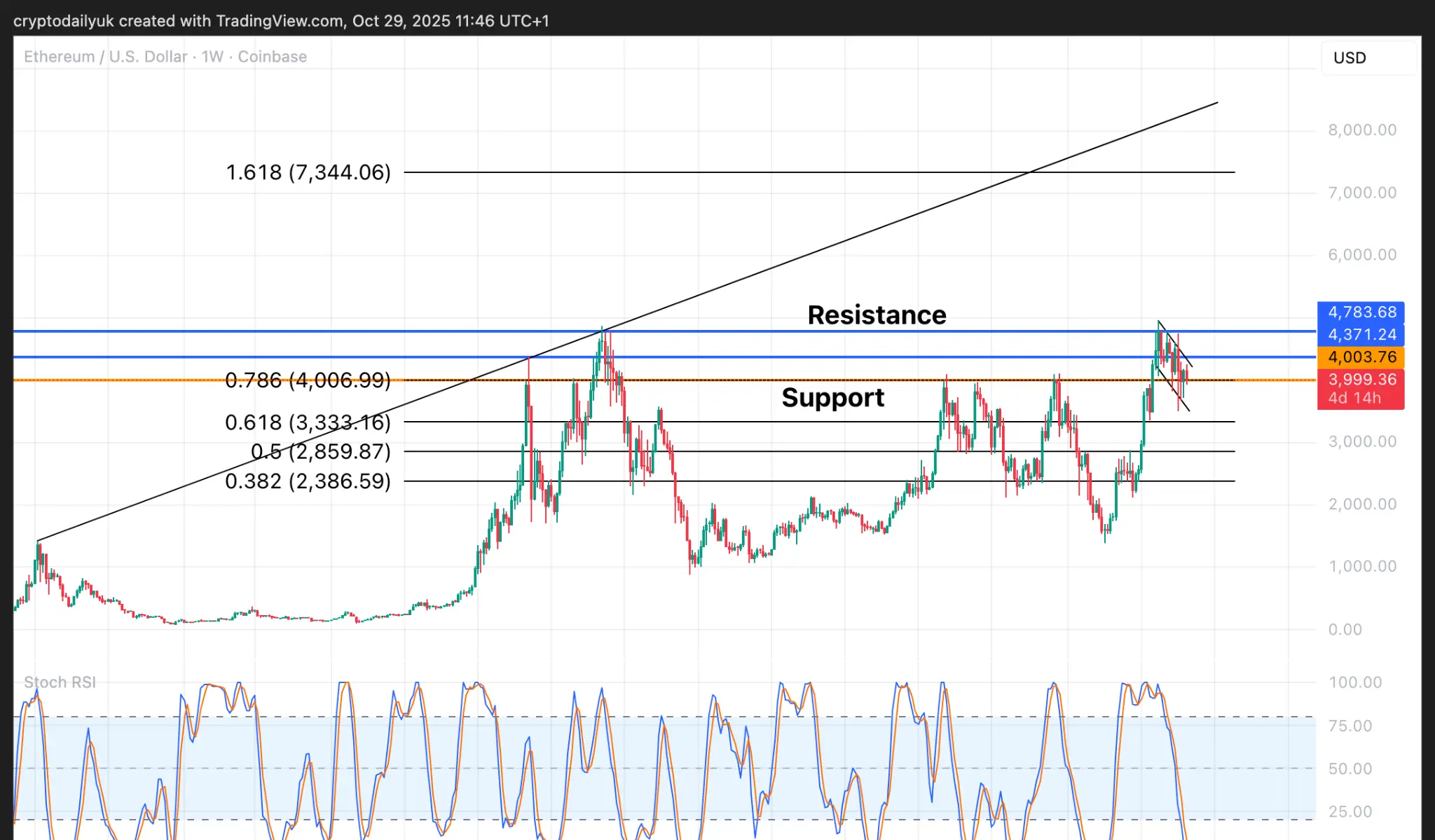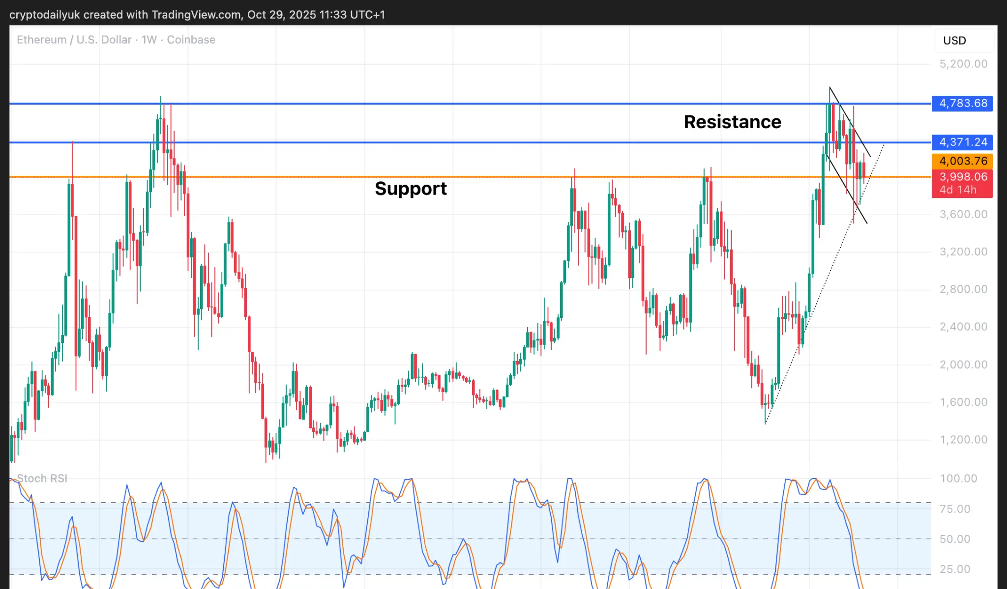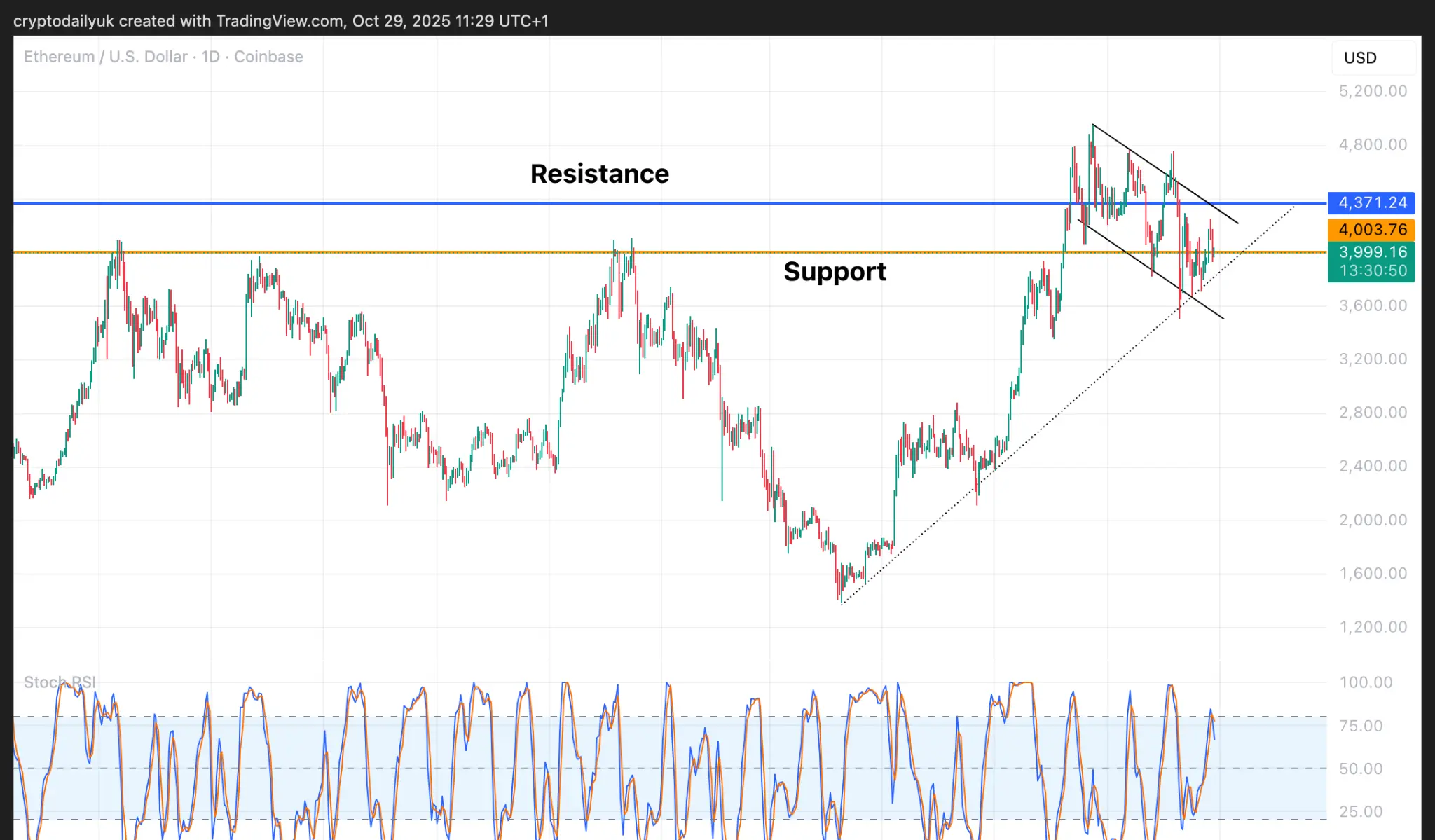 Dalam kerangka waktu harian dapat dilihat bahwa harga $ETH masih bergerak dalam sebuah bendera. Harga sebelumnya telah memantul dari garis tren naik (garis putus-putus samar) dan baru saja kembali untuk menguji kembali basis support horizontal yang sangat kuat di $4,000.