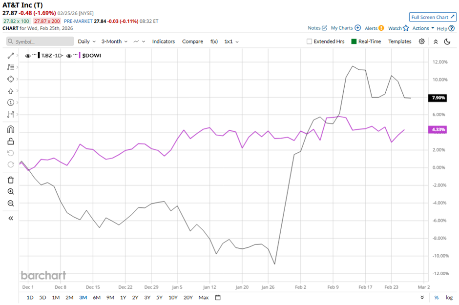 Saham AT&T naik 12,2% secara year-to-date (YTD), mengungguli kenaikan hampir 3% DOWI. Namun, dalam jangka lebih panjang, saham perusahaan telah naik 4,6% selama 52 minggu terakhir, tertinggal dari imbal hasil DOWI sebesar 13,4% pada periode waktu yang sama.