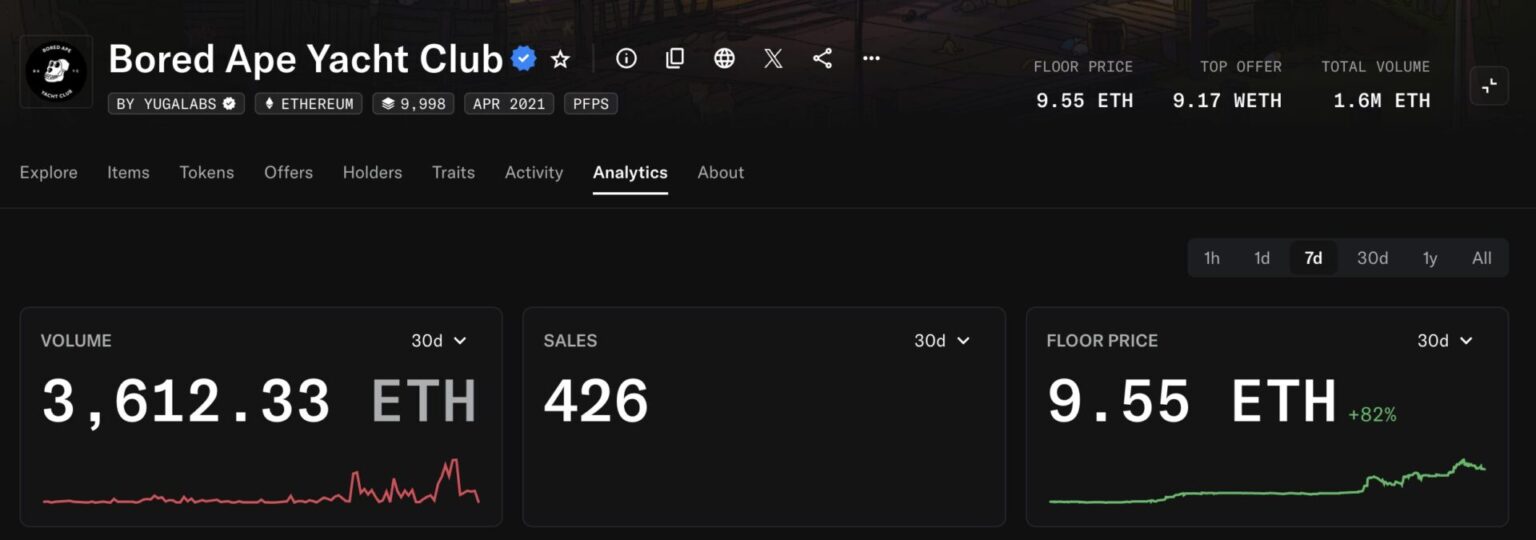 Sebagai contoh, untuk Penguin Gemuk, saat ini harga dasar sudah di atas 5 ETH, dengan kenaikan mingguan lebih dari 20%; selama 7 hari terakhir, sekitar 201 transaksi tercatat, volume transaksi mendekati 1.000 ETH; di sisi lain, harga dasar Bored Ape dalam 30 hari terakhir melonjak 81%, rebound dari titik terendah sebelumnya.