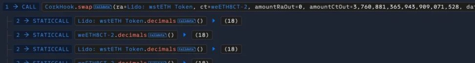 (3)攻撃者は、CorkHook関数のbeforeSwap関数の適切なアクセス制御の欠如を悪用して、カスタムフックデータをCorkCall関数に送信し、weETH8DS-2をフェイク_DSとフェイク_CTに分割しました。 これが可能なのは、weETH8DS-2がフェイクマーケットのRAであり、フェイク_DSとフェイク_CTを攻撃者のものと見なすためです。