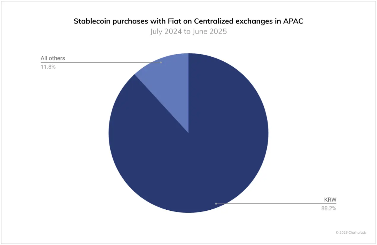 2023年12月以来、韓国の主要な取引所であるBithumbやCoinoneはUSDT/KRWの取引ペアを増やし、2025年初頭には取引量が50%以上急増しました。2025年6月までの12ヶ月間で、ウォンで購入されたステーブルコインは590億ドルに達し、トレーダーのステーブルコインに対する需要の強さを示しています。流動性の確保、ヘッジ、資産間の迅速な回転に利用されています。韓国国内でのステーブルコインに対する旺盛な需要は政策環境に影響を与えており、立法者や規制当局はウォンで支援されるステーブルコインのための規制フレームワークを検討しています。