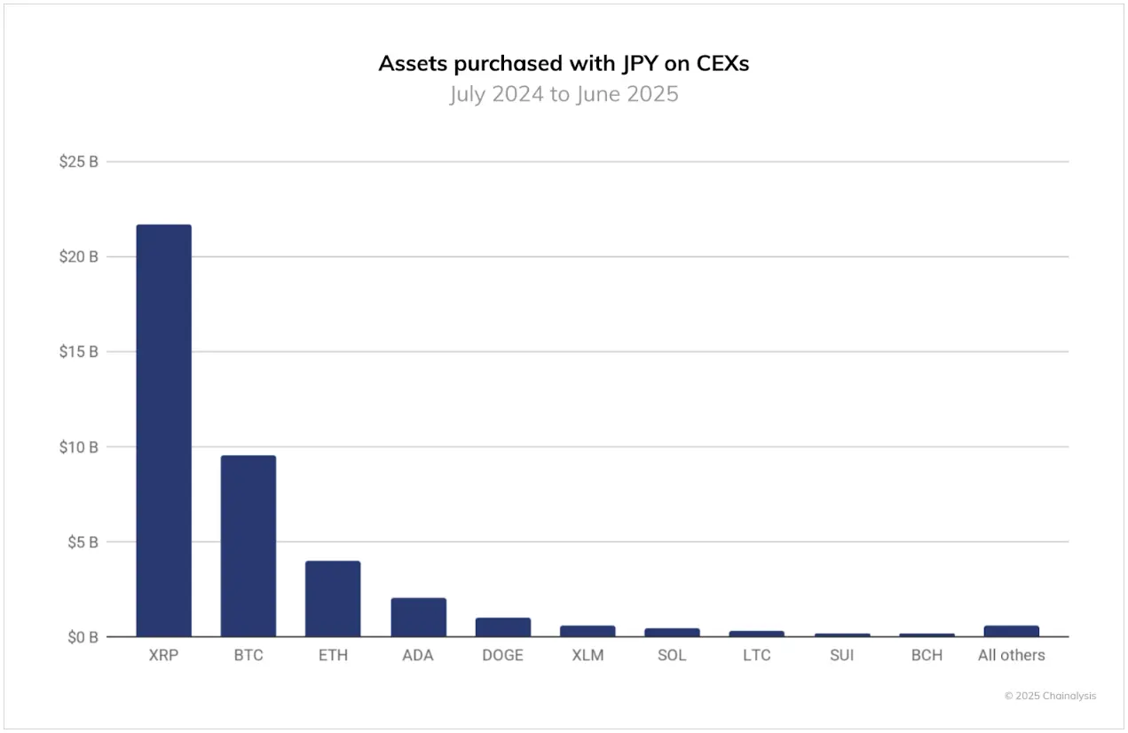 日本の成長は、暗号業界の重要な進展に続いています。しばらくの間、規制の制約が日本の取引所でのステーブルコインの上場を妨げていましたが、この状況は変わりつつあります。2025年6月までの12か月間に、円で購入された暗号通貨の主な流れはXRPに向かい、その法定通貨取引額は217億ドルに達しました。次いでビットコイン(96億ドル)やイーサリアム(40億ドル)が続きます。その中で、XRPの取引量が主導的な地位を占めており、投資家がXRPの現実世界での実用性に賭けている可能性を示しています。これはRipple社とSBIとの戦略的提携によるものです。今後、市場はUSDCやJPYCなどのステーブルコインの市場受容に注目するでしょう。
