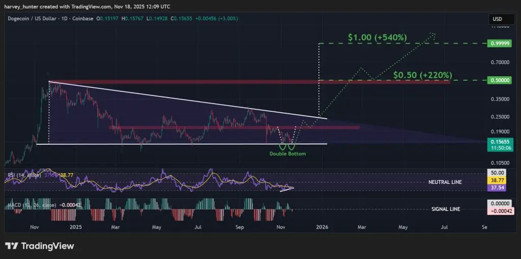 最近のダブルボトムパターンはこのレイアウトに重みを加え、0.155ドルをブレイクアウト試行の基盤として位置付けています。ダブルボトムパターンはテクニカル分析における反転信号であり、価格が二度同じ安値に達し反発することで形成されます。このパターンはその価格レベルに強力な買い支えが存在し、売り手が価格をさらに下げることができないことを示しています。DOGEが0.155ドルで定着し上にブレイクアウトできれば、ダブルボトムパターンが有効であることが確認されます。