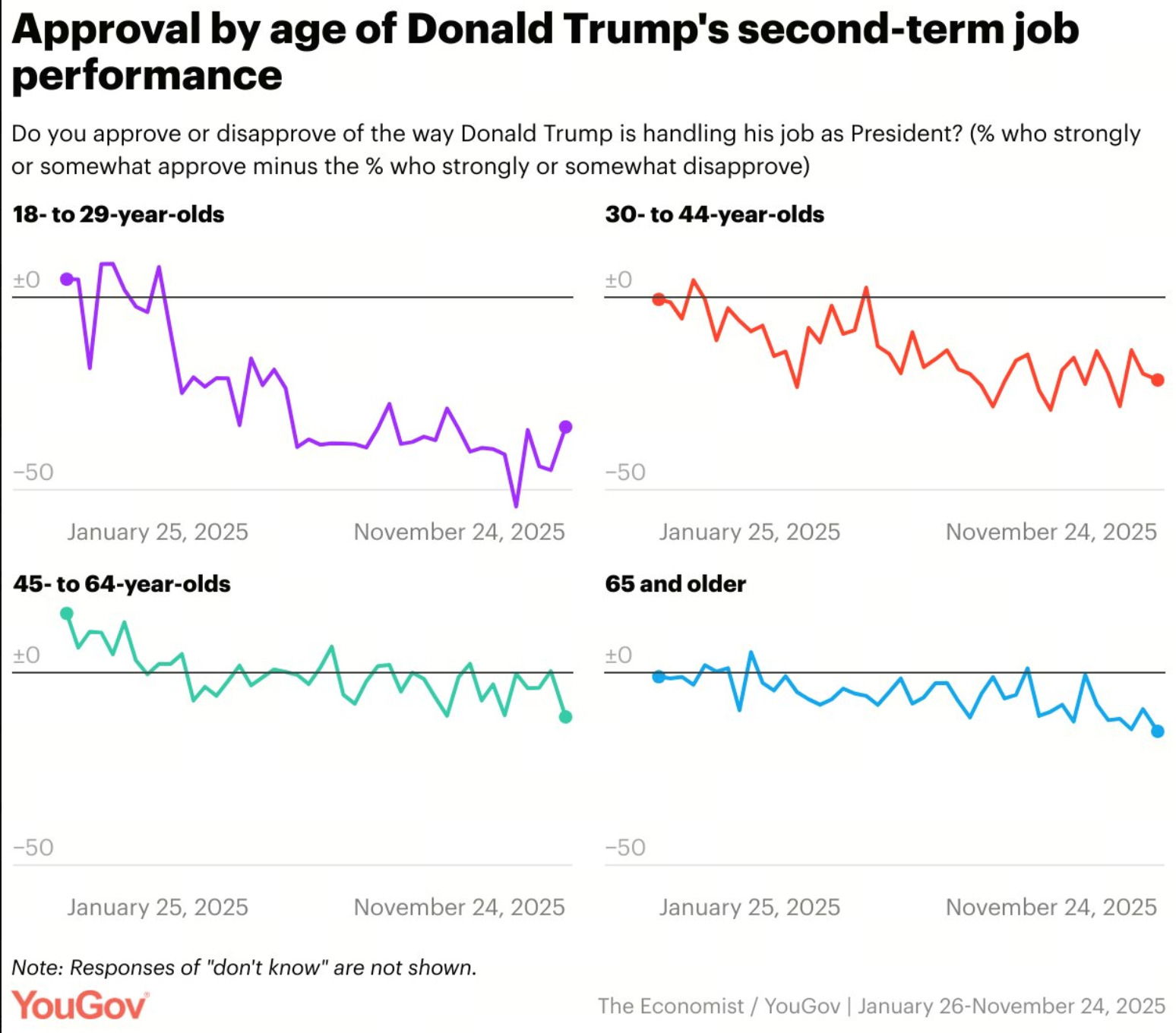 人口構造の分析から、ラテン系有権者の支持率の低下幅が最も大きく、15ポイントに達し、これは最近の移民政策の厳格化と密接に関連しています。同時に、18-29歳の若年有権者の支持率も選挙時の41%から33%に低下しており、新世代の有権者が政府の停滞や気候変動政策に不満を持っていることを反映しています。このような多次元的な支持率の流出が続くと、2026年の中間選挙における共和党の選挙情勢に影響を及ぼし、国会の力のバランスを変える可能性があります。