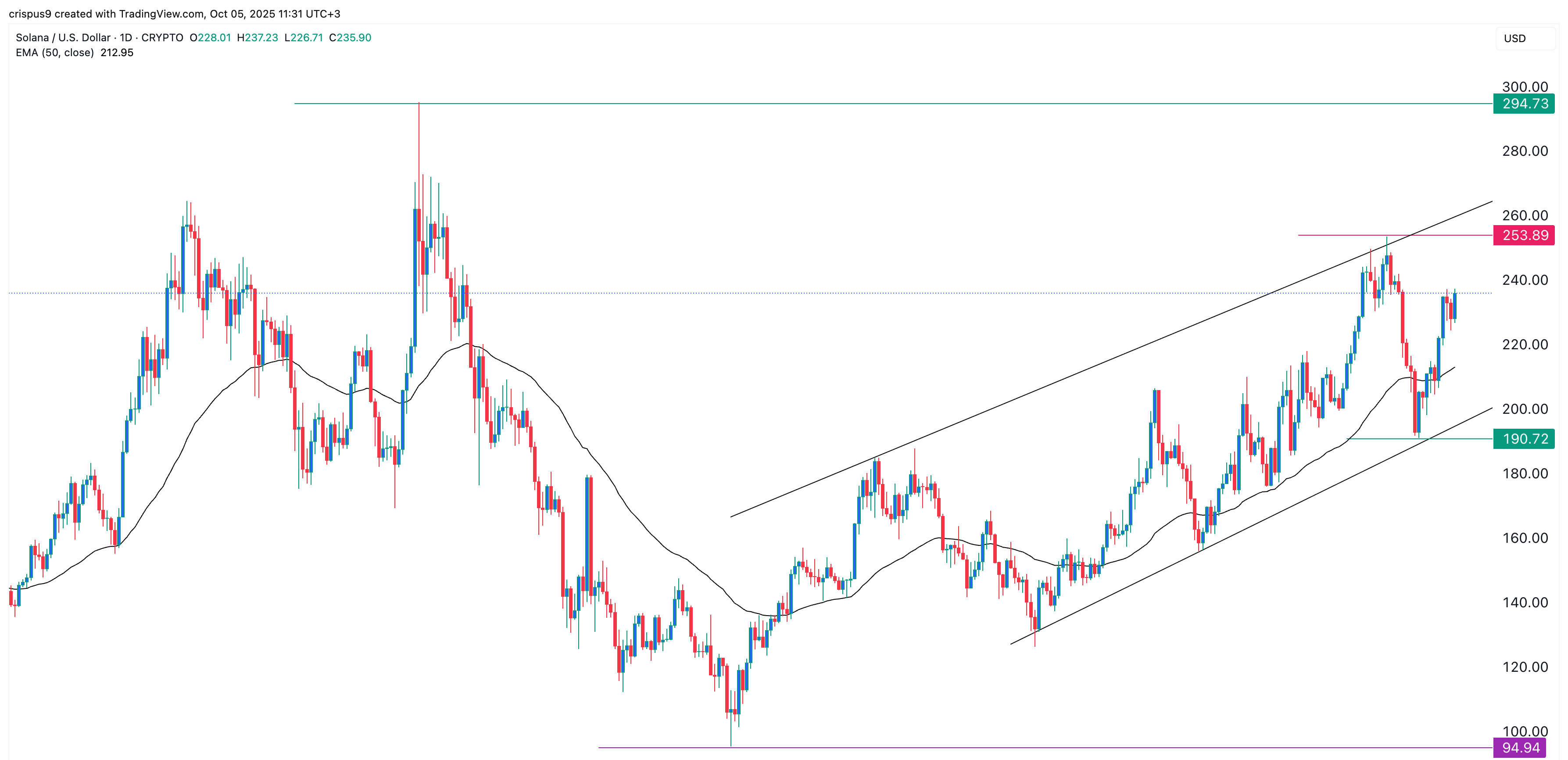 ソラナは、暗号市場が急上昇し、安定したコイン供給が最高記録を更新し、ステークされたSOL ETFの流入が急増した10月5日(日)に強力な上昇トレンドを再開しました。概要* SOLは$236に急騰しました---これは9月21日以来の最高価格で、今年の安値から150%上昇しています---強いファンダメンタルズと強気のテクニカルシグナルによって推進されています。* 重要な要因は、USD CoinやTetherが牽引するSolanaネットワーク上のステーブルコインの急成長で、流通量は$15 億に達しました。機関投資家の関心も高まっており、7月に開始された$404 万REX-Osprey SOL + ステーキングETF (SSK)に反映されています。* アナリストは、これをソラナへのより広範な信頼の兆しと見ており、SECによる将来のETF承認への期待が寄せられています。さらなる勢いは、ネットワーク性能の向上を目指すソラナの今後のアルペングロウアップグレードからも生まれる可能性があります。ソラナ (SOL) トークンは236ドルの高値にジャンプし、9月21日以来の最高水準となり、年初来安値から150%上昇しました。その強固なファンダメンタルズとテクニカル指標は、このコインが今年の記録的な高値にジャンプする可能性を示唆しています。新しいステーブルコインの法律に加えて、SOLの価格にとっての主要な要因は、ステーブルコインの成長が加速していることです。データによると、エコシステム内の総供給量は$15 億の記録的な高値に達しました。これは、年初来の最低値である54億ドルから大幅に増加しています。USDコインは107.6億ドル以上の資産を誇っています。次いで、テザーのUSDTが24.5億ドル以上の資産を持ち、PayPal USDは$614 百万ドルの資産があります。ソラナの価格にとってもう一つの主要な要因は、REX-Osprey SOL + ステーキング ETFの継続的な成長です。このファンドは7月に立ち上げられ、運用資産は$404 百万を超えています。SSKの成長は、アメリカの機関投資家がソラナや他の主要な暗号通貨に楽観的であることを示しています。例えば、ビットコインとイーサリアムのETFは、昨年以来$74 億ドル以上の流入がありました。したがって、このパフォーマンスは、投資家が証券取引委員会によって承認されると、他のソラナETFを購入する兆候であり、今月中に可能性があります。SOLの価格は、今後数ヶ月で行われるAlpenglowアップグレードの恩恵を受けるでしょう。ソラナ価格のテクニカル分析-------------------------------日足チャートは、SOLの価格が過去数日間で反発したことを示しています。この反発は、9月26日の最低水準である$190に達した後に始まりました。この最低水準は、上昇チャネルの下側と一致しています。ソラナの価格は50日および100日指数移動平均を上回り、$253で上昇チャネルの上側に近づいています。そのレベルを超える動きは、さらに上昇を示唆し、潜在的に$295の記録的な高値に達する可能性があります。