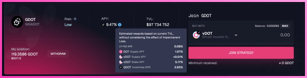 最も簡単に利回りを得る方法の1つは、ほぼすべてのトークンをGDOTにスワップすることです。シンプルな1クリックの利回り獲得戦略を使用すれば、利用可能な魅力的な機会を活用できます。現在、$vDOT の利回りはGDOT利回りの55%です。