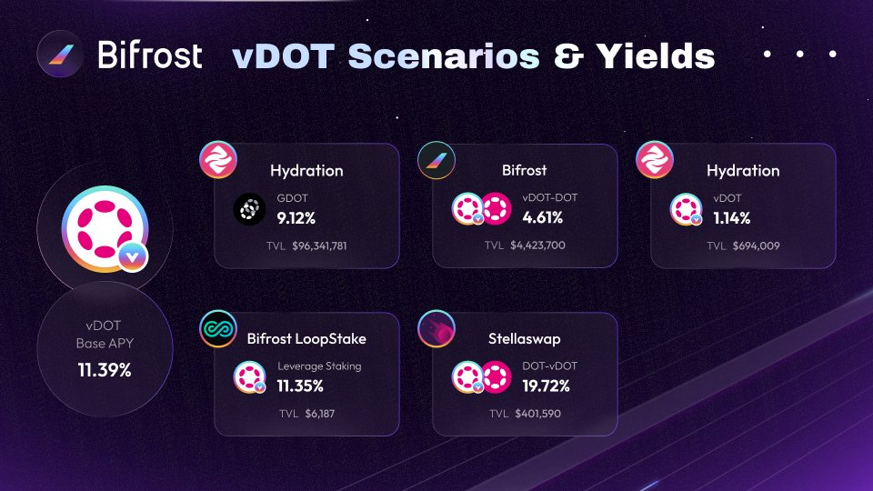 今週のvDOT利回りの更新へようこそ!あなたのリスク許容度に合わせたエキサイティングな機会がいくつかあります。vDOT利回りを最大化するためのさまざまな戦略を見ていきましょう。@hydration\_netの## 1️⃣ GDOT最も簡単に利回りを得る方法の1つは、ほぼすべてのトークンをGDOTにスワップすることです。シンプルな1クリックの利回り獲得戦略を使用すれば、利用可能な魅力的な機会を活用できます。現在、\$vDOT の利回りはGDOT利回りの55%です。## 2️⃣ ビフロストループステークvDOTのステーキング報酬を活用したい方のために、Bifrost LoopStakeはユニークな貸出/借入ループメカニズムを提供します。以下は主な特徴です:* **最大4倍のレバレッジ**: レバレッジを利用してステーキング報酬を増幅させましょう。* **清算なし**:清算リスクがないので、安心してお楽しみください。## 3️⃣ DOT-vDOT LP on @StellaSwap希望する流動性範囲に基づいてLPトークンを作成することで、収益を大幅に向上させることができます。範囲が狭いほど、収益の可能性が高くなります!さらに、\$STELLA をveSTELLAにロックすることで、リターンが大幅に増加し、ガバナンスの決定に対して投票することができます。## 4️⃣ ビフロストファーミング利益を最大化するには、LPを作成し、ファーミングプールに預けるだけです! \$BNC 報酬とスワップ手数料を\$BLP0 トークンの形で獲得できます (DOT-vDOT LPトークン)。---私たちは、これらの戦略をナビゲートするための豊富なチュートリアルを用意しています。Bifrost Support Labのリソースを自由に探索してください。最新情報をお楽しみに、そして幸せな稼ぎを!