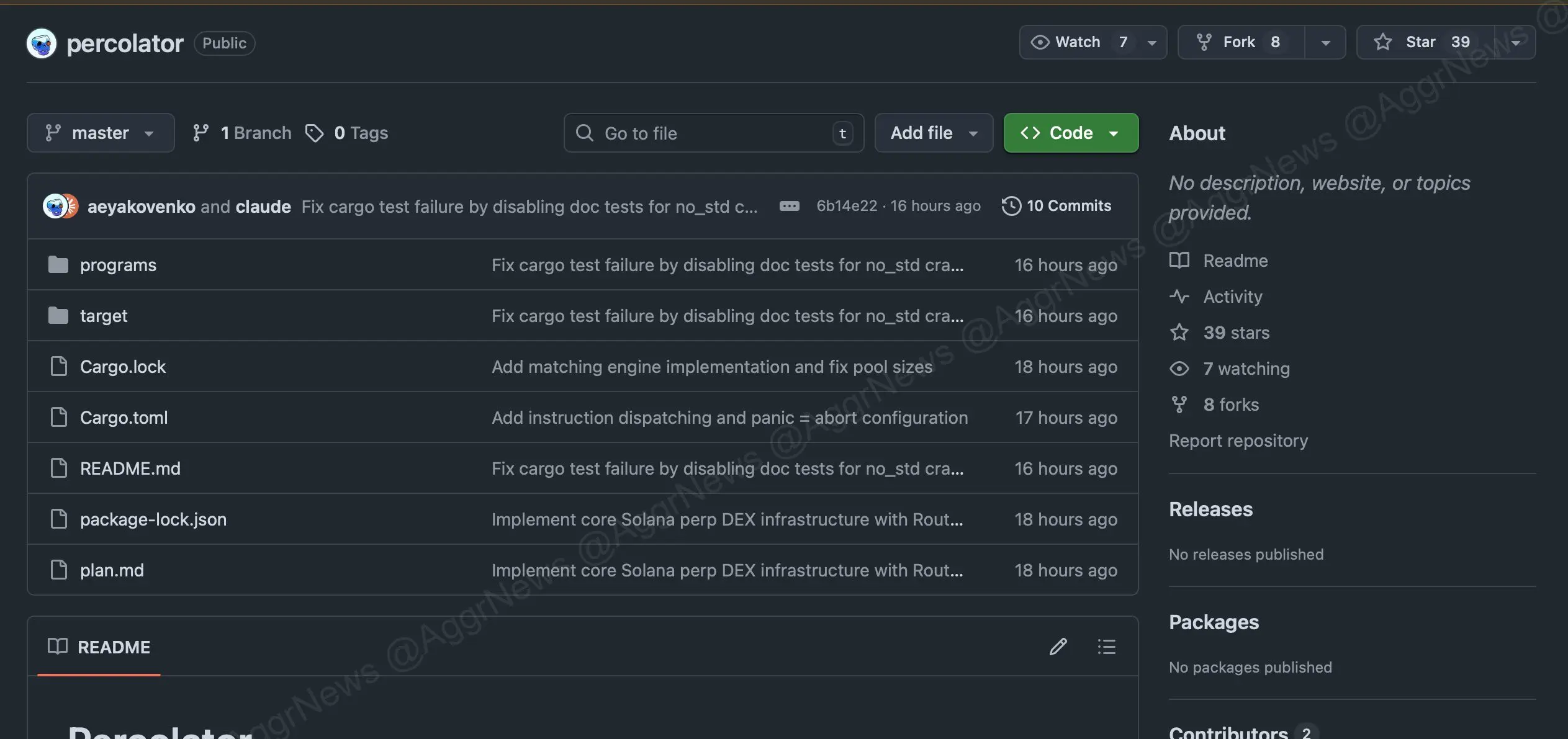 このプロジェクトはPercolatorと呼ばれ、Asterに似たSolanaネットワーク上のDEXを構想しています。AnatolyとClaudeはこの取り組みの主要な貢献者であり、16~18時間前に活発なコミットが行われたことから、プロジェクトは開発の初期段階にあることが示されています。公式なリリースやデプロイメントが行われていないため、ユーザーは数ヶ月間テストを開始できない可能性があります。
