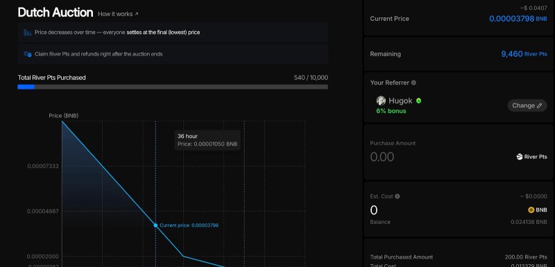 **シンガポール, シンガポール, 2025年10月27日**RiverはRiver Ptsパブリックセールを発表し、ダイナミックエアドロップコンバージョンを延長しました。これは、時間が価値の測定可能な次元となる初の時間エンコードされたトークノミクスです。従来のトークンローンチでは、価格は設計によって固定されています。Riverのシステムでは、時間と行動がカーブを形作ります。River Pts保有者は、180日以内に$RIVER にいつでも変換でき、その選択肢は市場の動向と組み合わさって価値を継続的に再定義します。過去1か月間、このシステムは強いトラクションを示しています:* DEXでリバーポイントアップ **+5,300%*** $RIVER アップ **5×** 、新しい **$10 ATH** に到達* **100,000人以上の参加者**がダイナミックエアドロップに参加しました* **1M River Pts ≈ $34,000** の Day 43 カーブ ( は $RIVER = $7) に基づいています**リバーピーツダッチオークション**- **開始:** 2025年10月29日14:00 (UTC)* **チェーン:** BNBチェーン- **資産:** River Pts- **購入:** BNB* **形式:** 48時間オランダ式オークション、価格は時間とともに減少します* **最終オークション価格:** みんなが最終(最安)価格で決済します参加者はオークション終了後に自分のRiver Ptsを請求し、価格差の返金を受けます。例 (イラストのみ)もしユーザーが$1 で100,000 River Ptsを購入し、最終清算価格が$0.5であれば、オークション終了後に100,000 River PtsとBNBで$50,000の払い戻しを受け取ります。**紹介ボーナスプログラム**各参加者は、リファラルコード(と彼らのXユーザー名)を共有して、**2--12%のボーナスRiver Pts**を獲得できます。これは、River4FUNシーズン2のランキングに基づいて段階的に付与されます。ボーナスは自動的に配布され、販売が終了した後にS3リーダーボードに追加されます。**パブリックセールに参加する方法**1. 公開販売ページにアクセスする2. BNBチェーンでウォレットを接続する3. 現在の価格と配分を確認する4. River Ptsの金額を入力し、BNBで購入5. (オプション) 参照コードを追加6. 購入を確認する4時間のオークション終了後、参加者はすべてのリバーポイントを請求し、払い戻しを行い、リバーポイントを$RIVER anytimeに変換することができます。**資金配分**販売されたすべてのユニットは、Riverの固定10億River Pts供給内のチーム留保分から来ています。調達された資金は:* 長期的な流動性とエコシステム統合を強化する* **$RIVER**トークンの自社買いをサポート* コミュニティガバナンスのためのブートストラップリバーDAO**リバー:市場への時間から進化する価値**ダイナミックエアドロップコンバージョンは、価値の源として時間を作りました。パブリックセールは市場を次の次元にします。価格から時間まで、デザインから発見まで --- Riverは価値がどのように創造され、分配され、定義されるかを進化させ続けています。**リバーについて**Riverは、エコシステム全体で資産、流動性、利回りを接続する最初のチェーン抽象ステーブルコインシステムを構築しています。