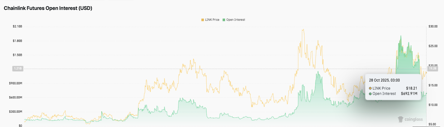 10月28日現在のデータによると、オープン・インタレストは6億9291万ドルに達し、LINKは18.21ドル付近で取引されています。これは、オープン・インタレストが$400 百万を下回った年央のレベルからの強い反発を示しています。