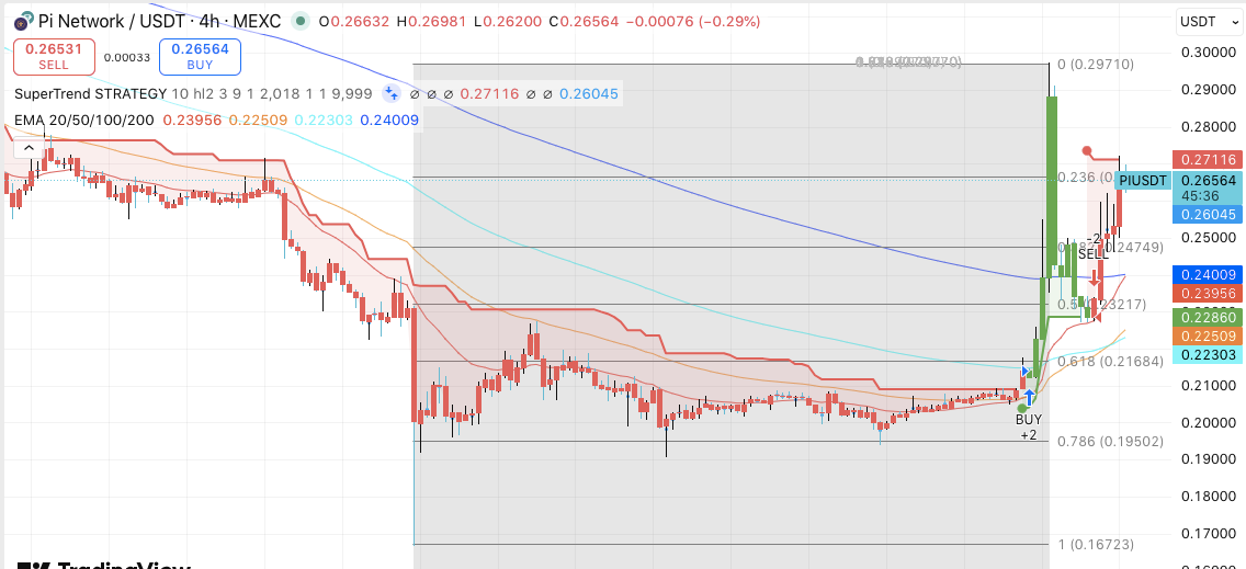 Piネットワーク (PI/USDT) は、最近の急騰で注目を集め、その後初期段階の反落が見られました。2日間で $0.167 から $0.297 に上昇した後、トークンは現在 $0.265 付近で落ち着いています。この動きは4時間チャートで強いブルリバーサルを示していますが、小さなローソク足と長いヒゲは、投資家が急騰後に利益を確定している可能性を示唆しています。
