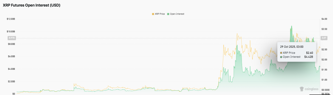 XRPの先物オープン・インタレストは8月以来大幅に増加しており、取引活動の増加と投資家の関心の再燃を反映しています。データによると、オープン・インタレストは10月29日までに44.2億ドルに急増し、2か月前の$1 億ドル未満から増加しました。このレバレッジのあるエクスポージャーの急増は、投機的なトレーダーや機関デスクからの参加が増えていることを示しています。