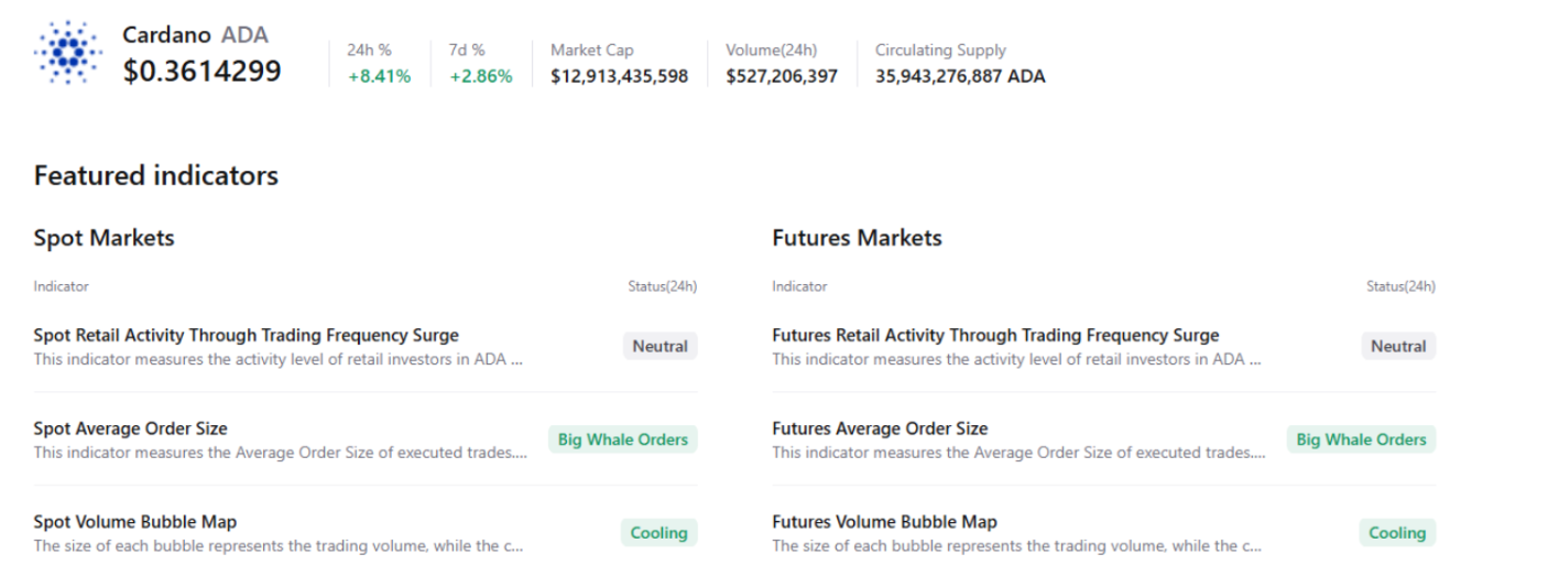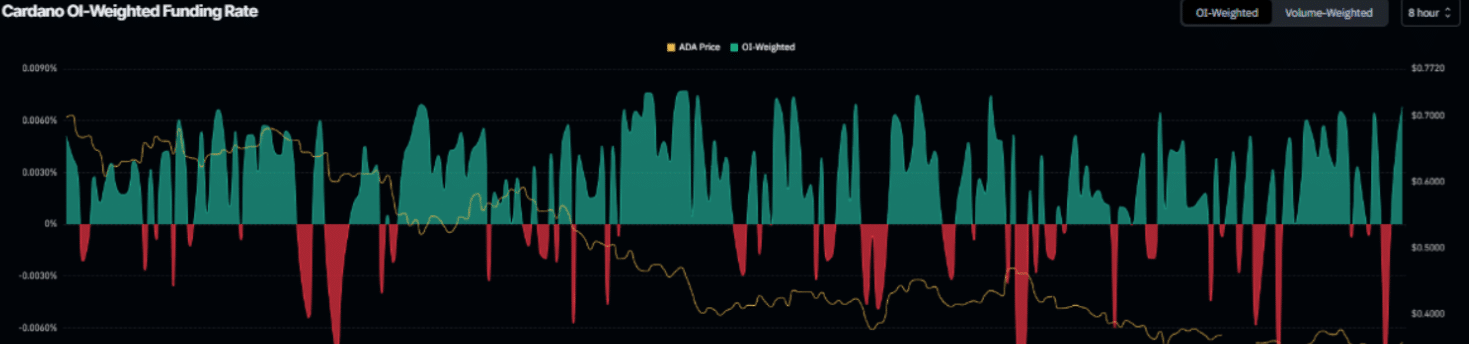 最新のデータによると、スポット市場と先物市場の両方でホエールの活動が増加している。さらに、市場状況の緩和は、Cardano価格に対する明確な買い側の楽観主義を浮き彫りにしている。これらのシグナルは、トレーダーのセンチメントの改善を示し、近い将来の強気のブレイクアウトの可能性を高めている。
