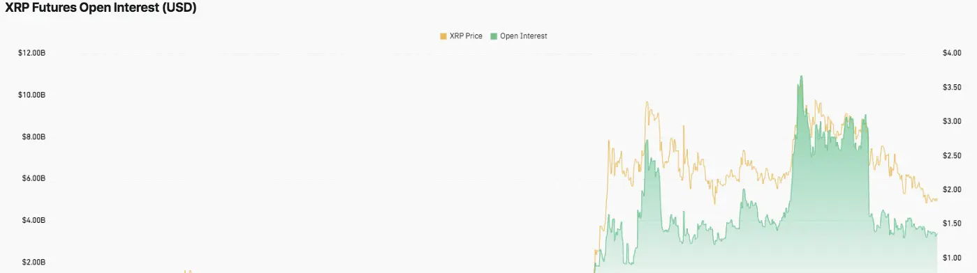 デリバティブのデータは、投機的ポジションの縮小を強調しています。XRPの先物未決済建玉は拡大し、$3.50〜$3.80の範囲に向かって価格が上昇するにつれて、$2 十億ドル未満から$10 十億ドル超へと増加しました。その増加は、ボラティリティの高まりとレバレッジのあるポジションの増加と一致しています。