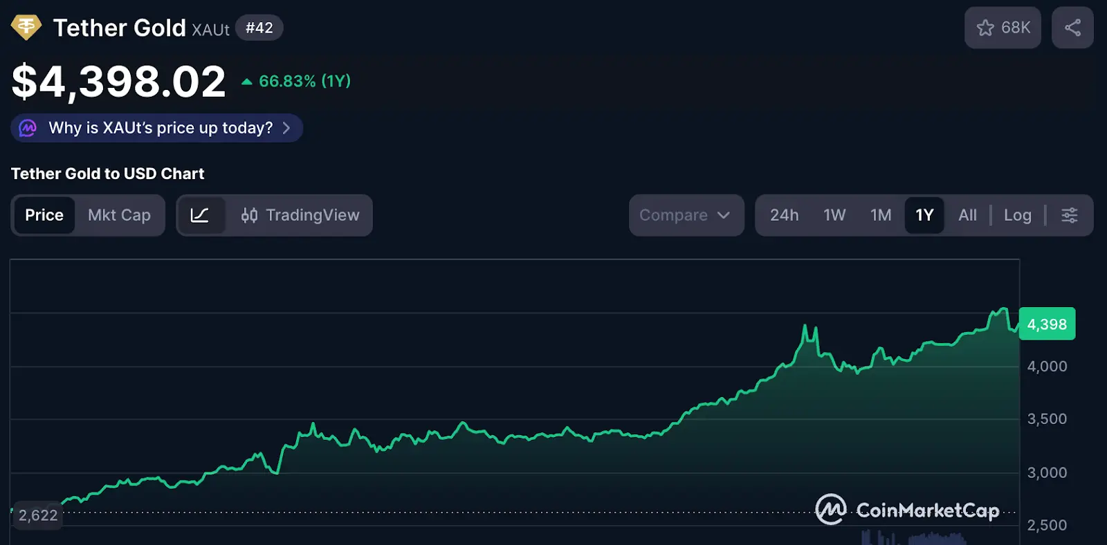 XAUTは、実物の金をオンチェーン化したもので、最も具体的な資産裏付けトークンの一つです。純粋な暗号投機資産ではありませんが、その価格は一般的に金市場の動向に連動し、プレミアムや取引量によって調整されます。