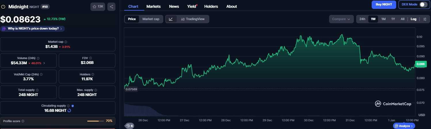 ミッドナイト (NIGHT)は、Cardano (ADA)ネットワーク上に構築されたプライバシー重視のトークンであり、多くの点で2025年12月の象徴的なローンチとなり、最初の1週間で$1 10億の時価総額に急騰しました。