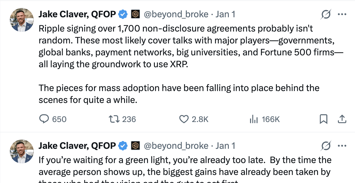 Source: CryptoNewsNetOriginal Title: Jake Claver Says Timelines Always Get Extended, Stands by His XRP PredictionOriginal Link: 暗号通貨創設者のJake Claverは、2025年のXRP価格予測の失敗を認め、批評家たちがポイントを見失っていると述べています。彼は、規制当局や大手機関と協力する際には遅延が普通であり、主要なプロジェクトはほとんど常に計画より長くかかると主張しています。彼はRippleの13.5年にわたる歴史を、実際の金融システム構築には時間がかかる証拠として挙げています。一方、ClaverはXRP採用に関する彼の「ドミノ理論」は変わっていないと述べています。彼は、規制の明確化、市場の変化、実世界の出来事が最終的に結びつき、XRPを将来の金融市場の重要な一部にすると信じています。## 舞台裏の採用ストーリー別のツイートでは、ClaverはRippleが報告している1700以上の秘密保持契約(NDA)の署名を強調しました。詳細は非公開のままですが、その規模はRippleが政府、グローバル銀行、決済ネットワーク、大学、フォーチュン500企業と協議しているとの憶測を呼んでいます。この議論は、これらのNDAが偶然ではなく、XRPベースのシステムの長期的な土台作りの一環であるというものです。この観点から見ると、目に見える価格動向はインフラ整備に遅れをとっていると考えられます。つまり、採用はすでに静かに進行している可能性があり、市場は待ちきれない状態にあります。Claverはまた、投資家の心理に大きく依存しています。彼は、XRPの役割が一般の人に明らかになる頃には、最大の上昇余地はすでに失われていると示唆しています。彼の見解では、早期のポジショニングこそが大きなリターンを生むものであり、公的な確認ではないとしています。## 目標価格未達後の反発特に、Claverのコメントは、数日前にアナリストのZach Rectorからの批判を受けており、Rectorは2025年のClaverのXRP予測を公に非難しました。Rectorは、短期間で5,000%の動きが起こる可能性は考えにくいと主張し、Claverがミスを認めずコミュニティを誤導していると非難しました。この論争はソーシャルメディアやYouTubeに拡散し、XRP支持者と批評家の間で賛否両論の反応を呼びました。タイムラインの未達だけでなく、Claverはさらに大きな予測も引き合いに出しており、XRPが「プログラムされた」ように10,000ドルに到達すると主張しています。彼の理論は、ユーティリティに焦点を当てており、高価格がXRPを大規模な機関間取引の決済にとってより効率的にすると論じています。批評家は、そのレベルは極端な時価総額を意味すると反論し、市場資本は無関係だという考えを否定しています。## 市場の焦点は2026年へ移行2025年の終わりとともに、多くの投資家は大胆な価格予測から離れ、2026年に向けた測定可能な採用指標に焦点を移しています。XRPはまだ2ドル未満のため、短期的なターゲットから長期的な実行へと話題は移っています。一方、Claverの最新のコメントは、彼が忍耐とインフラ整備に賭けており、タイムラインよりもそちらを重視していることを示唆しています。