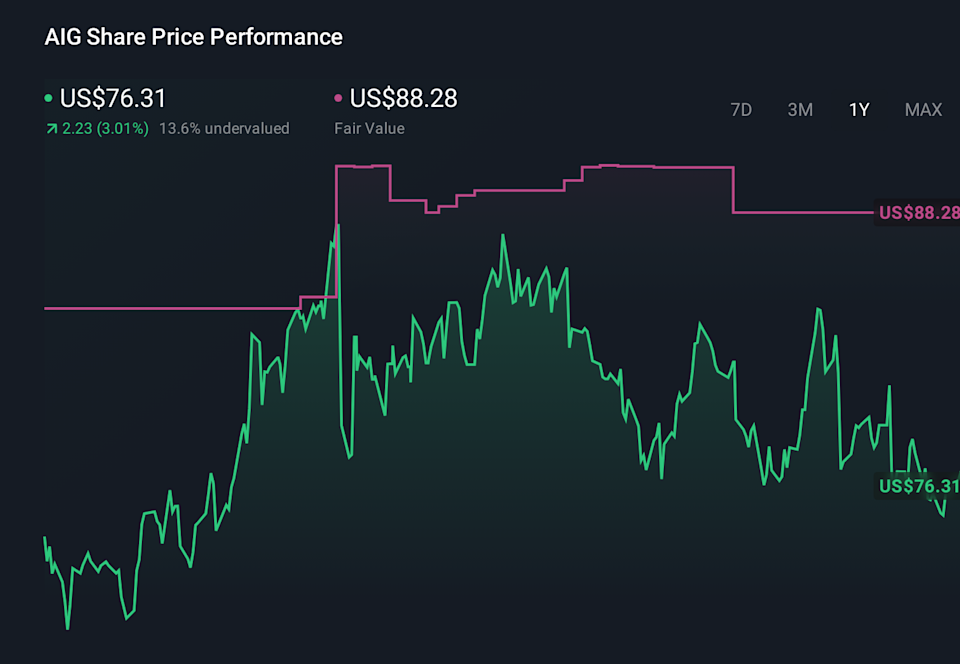 From here, it may be useful to track how AIG discloses earnings contributions from the Convex quota share and Onex related income, especially in relation to analyst expectations around EPS and revenue. For a broader sense of how these moves fit into the longer term story and how other investors interpret them, you can review community narratives on AIG’s dedicated page before deciding what this means for your own portfolio.
