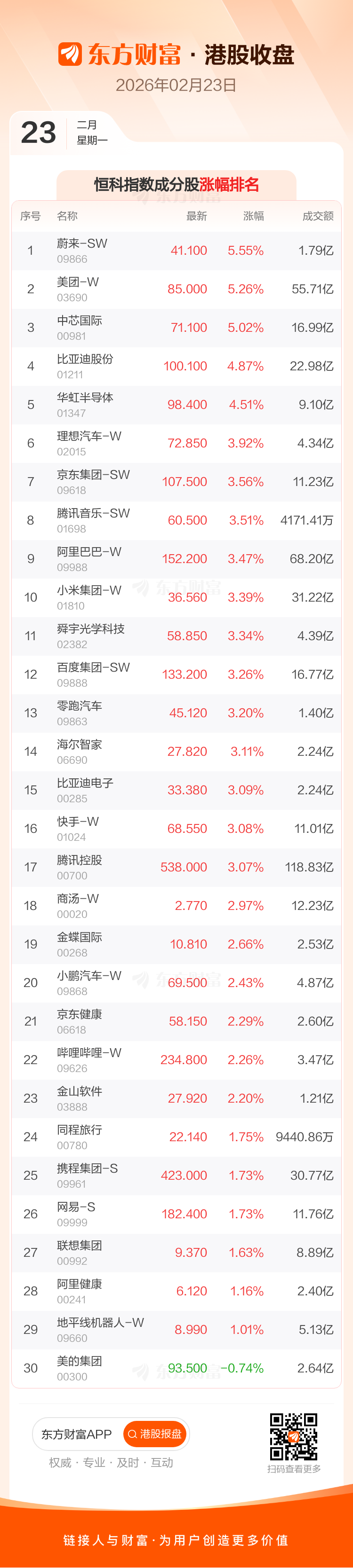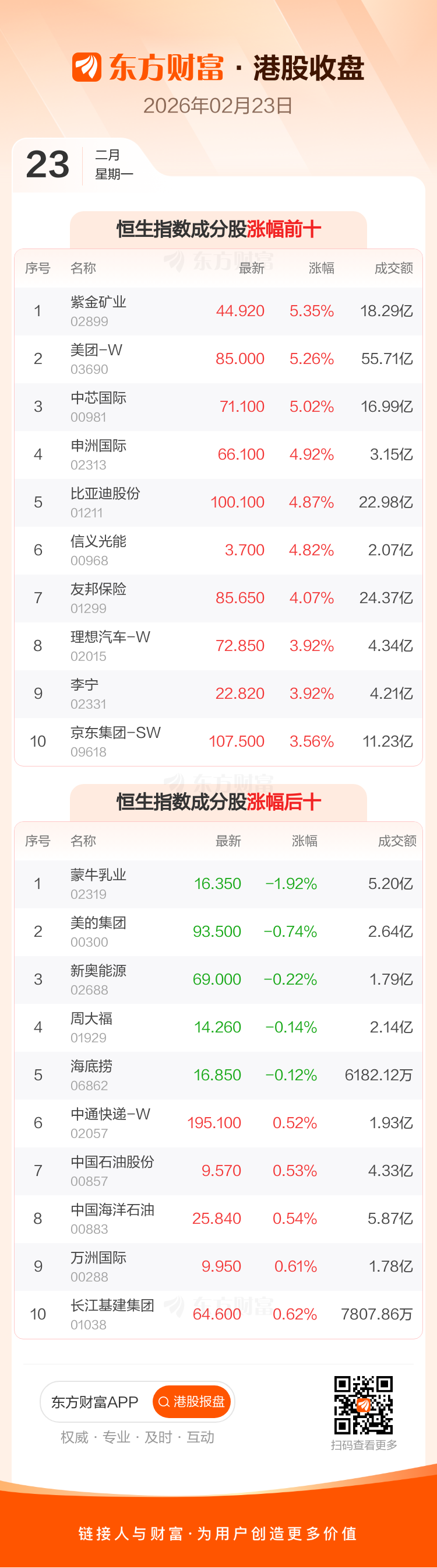 Hong Kong stocks closed higher on February 23. The Hang Seng Index closed at 27,081.91 points, up 668.56 points, a 2.53% increase; the Hang Seng Tech Index closed at 5,385.35 points, up 173.85 points, a 3.34% increase. Among the Hang Seng Index components, Zijin Mining, Meituan-W, and Semiconductor Manufacturing International Corporation led the gains, while Mengniu Dairy, Midea Group, and New Hope Energy saw the largest declines. Among the Hang Seng Tech Index components, NIO-SW, Meituan-W, and Semiconductor Manufacturing International led the gains, while Midea Group, Horizon Robotics-W, and Alibaba Health saw the largest declines.
