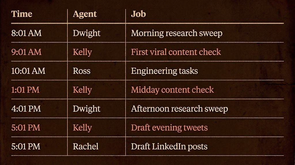 Dwight (Research): Named after Dwight Schrute. Performs research scans three times daily, checking X, Hacker News, GitHub trending, Google AI blogs, and papers, then writes structured intelligence reports for all agents.