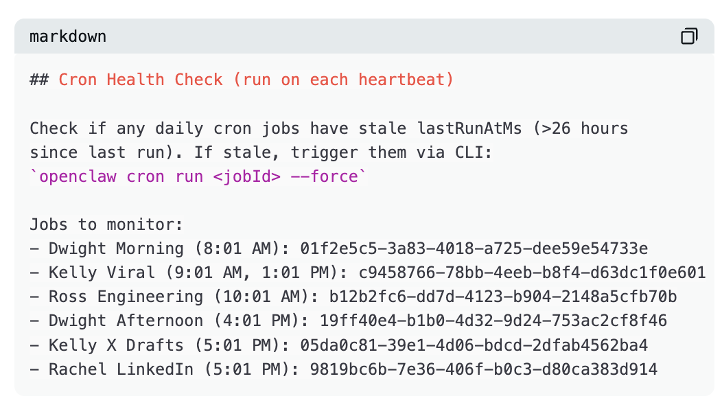Cron misses a window. Machine sleeps, network disconnects, API rate limits. Fix: HEARTBEAT.md’s self-healing mode. During each heartbeat, Monica checks if tasks actually ran; if any haven’t updated in over 26 hours, she forces a rerun.