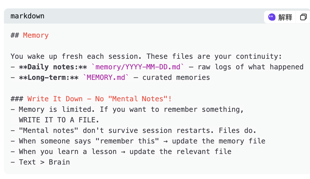 Long-term memory (MEMORY.md): distilled insights from daily logs—lessons learned, preferences discovered, patterns noticed.