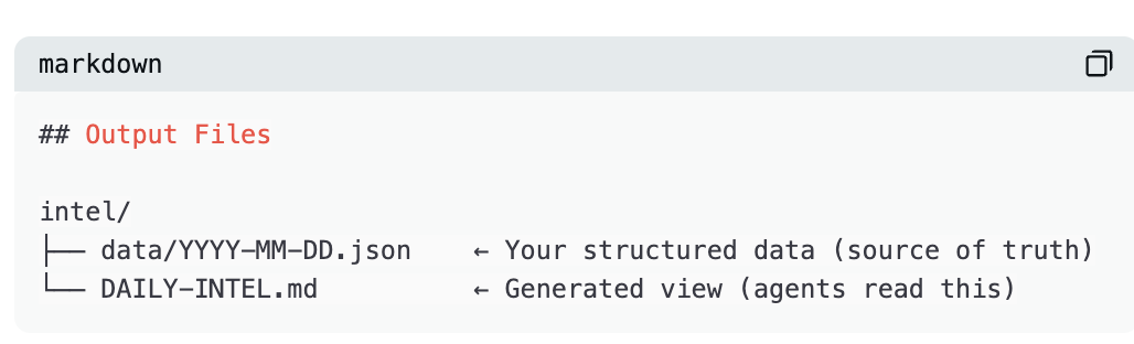 Structured data in JSON, human-readable summaries in markdown. Agents read markdown; JSON is the source of truth for deduplication and long-term tracking.