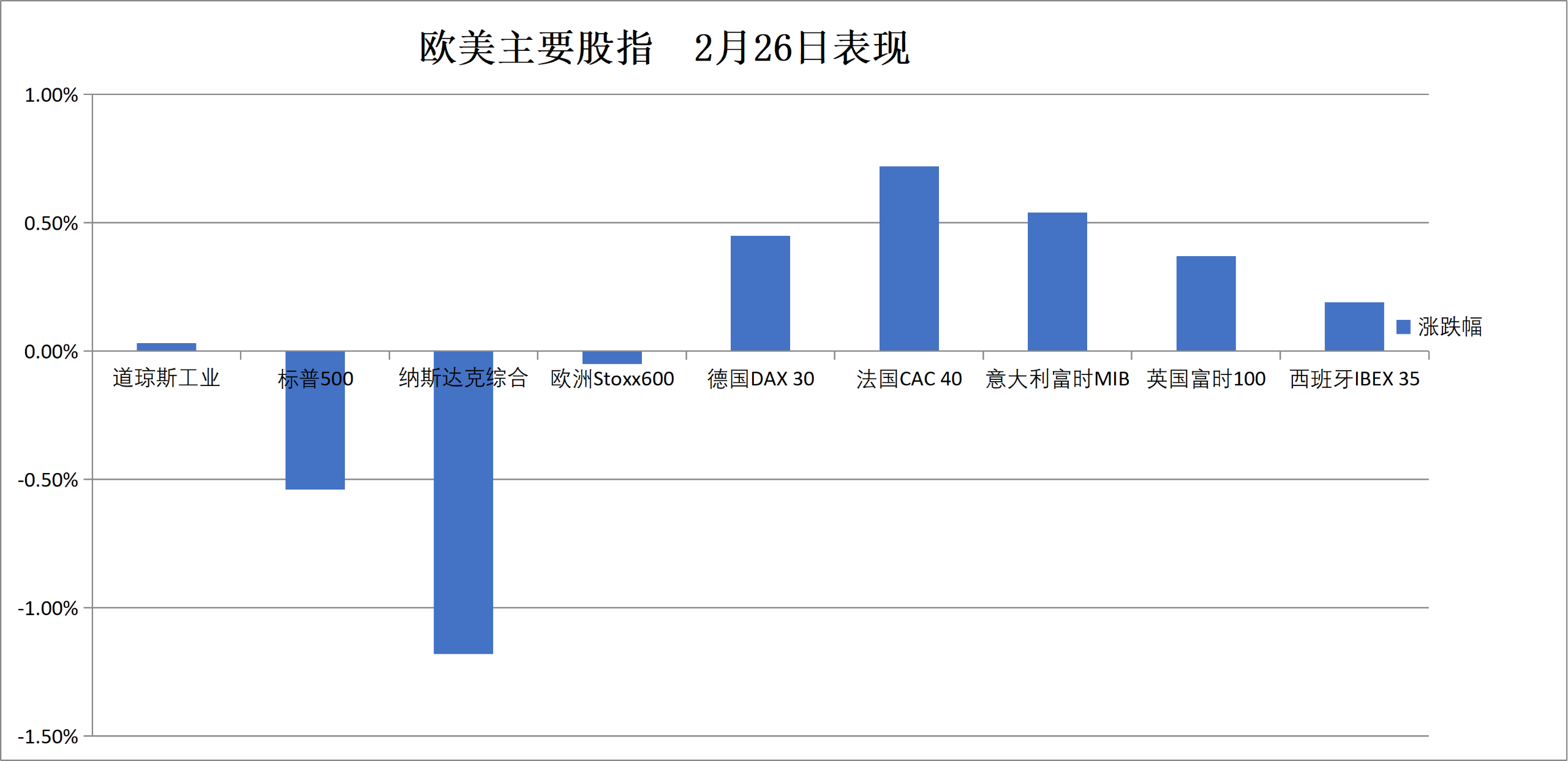 US and European stocks: S&P 500 down 0.54%, at 6,908.85 points. Dow up 0.03%, at 49,499.20 points. Nasdaq down 1.18%, at 22,878.383 points. Europe’s STOXX 600 index fell 0.05%, at 633.18 points.