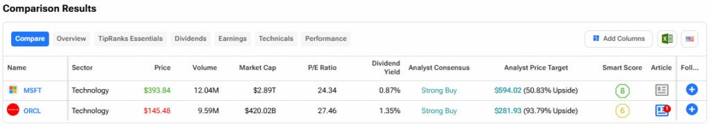 Turning to Wall Street, out of the two stocks mentioned by BNP, analysts think that ORCL stock has more room to run than MSFT. In fact, ORCL’s price target of $281.93 per share implies 93.8% upside versus MSFT’s 50.8%.