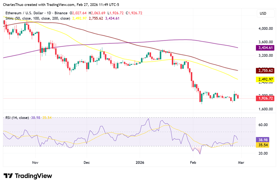 執筆時点で、ETHは1,937.26ドルで取引されており、24時間で4.4%下落し、重要な節目となる2,000ドルを下回っています。