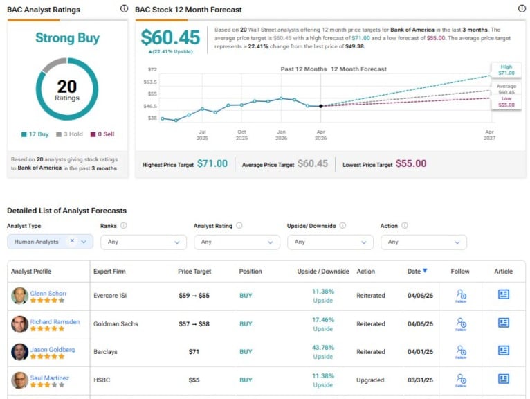 Wall Street’s view on Bank of America remains quite bullish. Over the past three months, the stock has received 20 ratings, 17 Buys and three Holds, resulting in a Strong Buy consensus. The average price target currently sits at $60.45, implying roughly 22.4% upside from current levels.